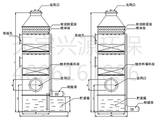 廢氣凈化塔利用氣體與液體間的接觸,而將氣體中的污染物傳送到液體中,然后再將清潔氣體與被污染的液體分離,達(dá)到清凈空氣的目的。廢氣經(jīng)由填充式廢氣凈化塔,采用氣液逆向吸收方式處理,即液體自塔頂向下以霧狀(或小液滴)噴撒而下。廢氣則由塔體(逆向流)達(dá)到氣液接觸之目的。此處理方可冷卻廢氣、調(diào)理氣體及去除顆粒,再經(jīng)過除霧段處理后,排入大氣中。洗滌后,廢液收集至集水槽中,再排放至廢水系統(tǒng)處理。