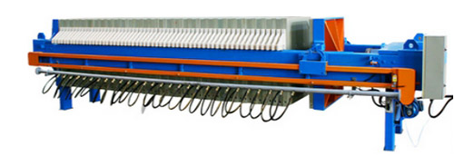 隔膜壓榨壓濾機(jī)由隔膜板和廂式濾板排列組成濾室,在輸料泵的壓力作用下將漿料輸入濾室,通過過濾介質(zhì)(濾布)將漿料中的固體和液體分離,當(dāng)漿料中的固體形成餅后,再向隔膜通入空氣,對濾室內(nèi)的固體充分壓榨,降低含水率。對于粘性物料的過濾及對含水率要求高的用戶,此機(jī)更有其獨(dú)特的特性。