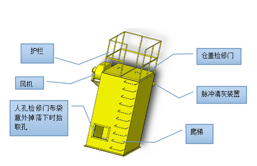 控制系統: 控制風機的啟動及清灰裝置設備定時脈沖清灰,保證濾袋的通氣性,清灰掉落的物料直接掉入掉料倉。